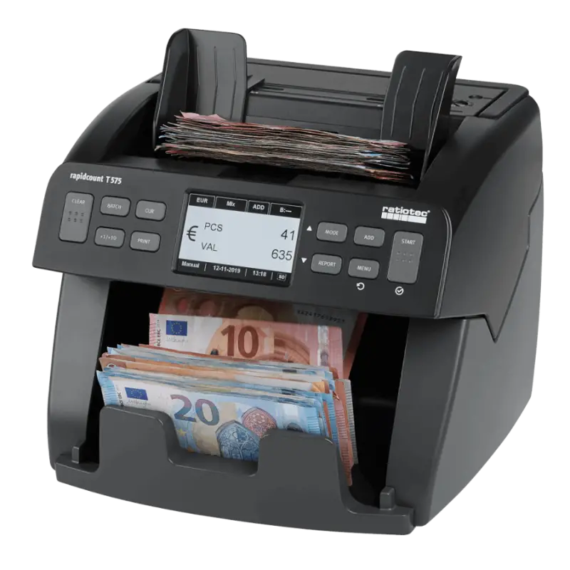 La Rapidcount T 575 est très professionnelle pour des volumes moyen de comptage. Doté d'une trémie à chargement frontal de 300 billets, la Compteuse et détecteur de billets T575 est conçu pour compter rapidement et avec précision les billets non triés. La vitesse de comptage peut être ajustée en fonction de l'état des billets - 1000 ou 1200 billets par minute. De plus, lorsque le comptage est terminé, l'appareil peut afficher un rapport détaillé qui comprend la valeur totale comptée, le nombre de billets comptés. Détection de contrefaçon intégrée Le T 575 dispose d'une détection de contrefaçon de pointe pour valider les billets au fur et à mesure qu'ils sont comptés. Chaque billet est vérifié pour les marques UV appropriées, l'encre magnétique, le fil métallique, les marques infrarouges, les images, les dimensions et l'épaisseur. Plusieurs devises disponibles La Compteuse et détecteur de billets T575 peut compter les devises suivantes : le dollar américain (USD), les euros (EUR), les livres sterling (GBP) et les francs suisses (CHF). Le T 575 peut également être programmé pour d'autres devises, sur demande.